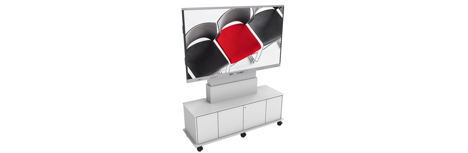 Media sideboards are used for integrating presentation technology such as displays, projectors or screens. Such equipment must be ready for use and stowed away again within seconds. Connection panels for your own equipment and storage space, e.g. for office materials or catering, round off a successful media sideboard.